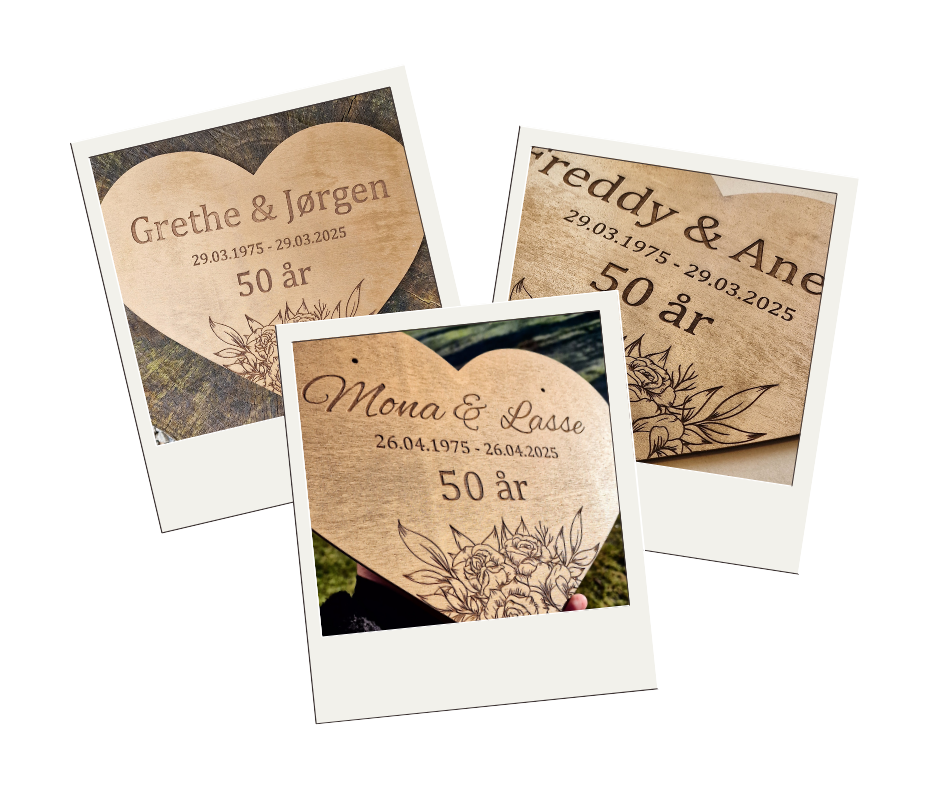 Midtpunktet i æresporten er ofte det personlige hjerte med navnene på brudeparret og datoen for guldbrylluppet. Hos Gizmo.dk tilbyder vi specialdesignede guldbryllupshjerter i materialer som træ, MDF eller akryl, som kan personliggøres helt efter ønske.