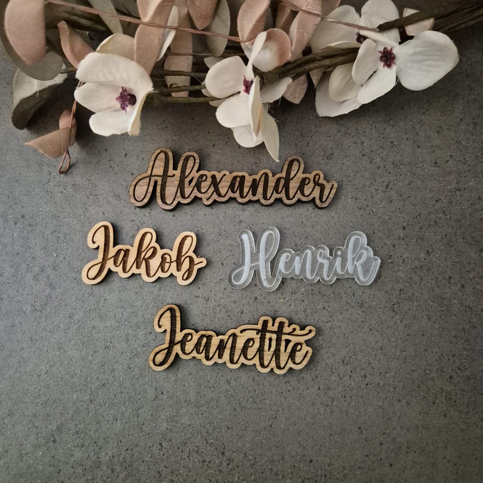 Specialdesignede bordkort er en personlig og kreativ måde at præsentere dine gæsters navne på. De er ikke masseproducerede standardløsninger, men derimod laserskårne og graverede i de materialer, du foretrækker. Vores bordkort er derfor ikke kun praktiske, men også dekorative elementer, der kan bidrage til at fuldende temaet eller farveskalaen for din fest. Med laserskæring får du skarpe linjer, præcise detaljer og et professionelt finish. Vi graverer gæstens navn på kortet, så du ikke behøver at bekymre dig om at skrive i hånden eller om klodsede klistremærker.