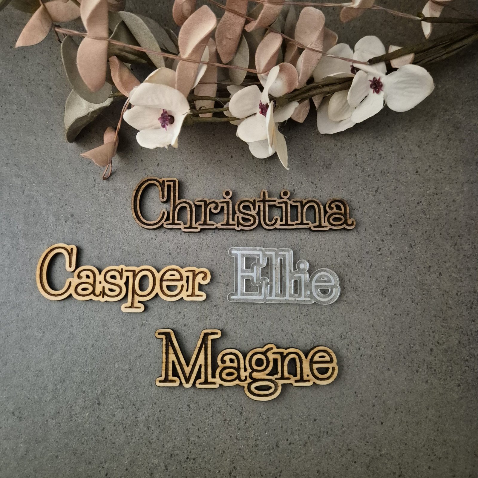 Giv din fest et personligt præg med vores smukke bordkort, der laserskæres og graveres efter dine ønsker. Vælg mellem birk, eg, valnød eller akryl for at matche netop dit tema. Hvert bordkort graveres med gæstens navn for en unik og mindeværdig detalje. Vi tilbyder et bredt udvalg af designs og former, og har du særlige ønsker, hjælper vi gerne med at gøre din idé til virkelighed. Bordkortene passer perfekt til bryllupper, konfirmationer, barnedåb, fødselsdage og firmafester, hvor de både skaber overblik og pynter på bordet. Vores fokus på kvalitet og præcision sikrer et professionelt resultat, mens det holdbare materiale gør, at gæsterne kan gemme kortene som et varigt minde. Bestil dine specialdesignede bordkort i dag og løft stemningen ved din næste fest!