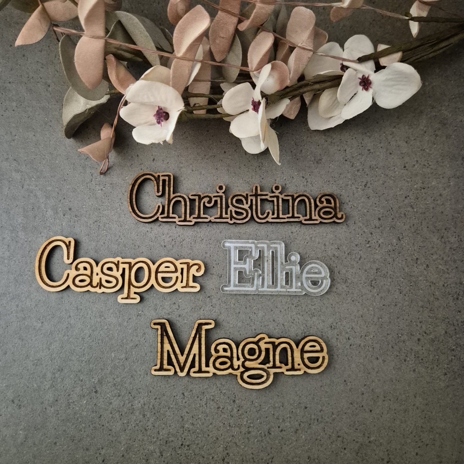 2. Vælg materiale: Start med at beslutte, om du vil have dine bordkort i birk, eg, valnød eller akryl. Overvej festens tema, farver og den ønskede stemning.