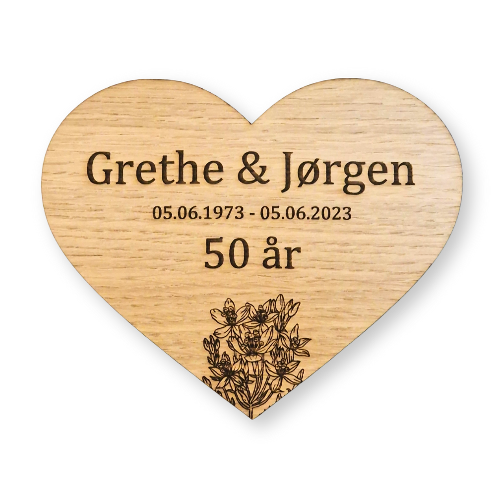Lad os hjælpe dig med at skabe et hjerte til æresport, der matcher din unikke stil og personlighed. Brug vores designskabelon, indtast dine ønskede oplysninger, og lad os tage hånd om resten. Vi leverer et færdigt produkt, der vil gøre jeres æresport helt speciel. Vælg din favorit blandt vores udvalg af træsorter og farver, og glæd dig til en elegant og betydningsfuld detalje, der vil være et minde for livet.