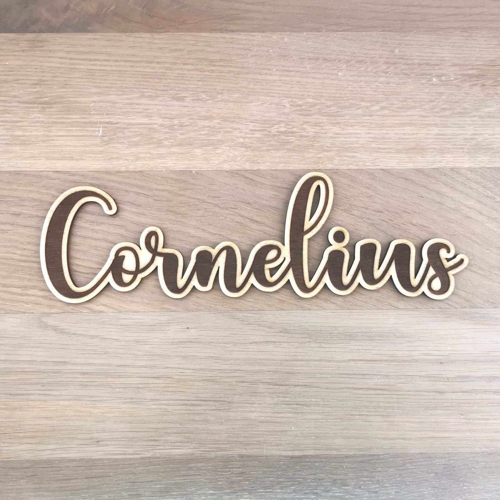 Enkelt og fint skilt i træ med navn. Bogstaverne er ca 7,5-10 cm i højden alt efter hvad der skal graveres og hvor mange tegn der er.