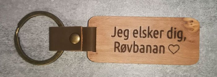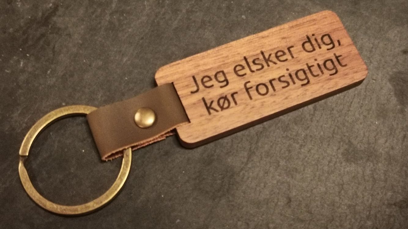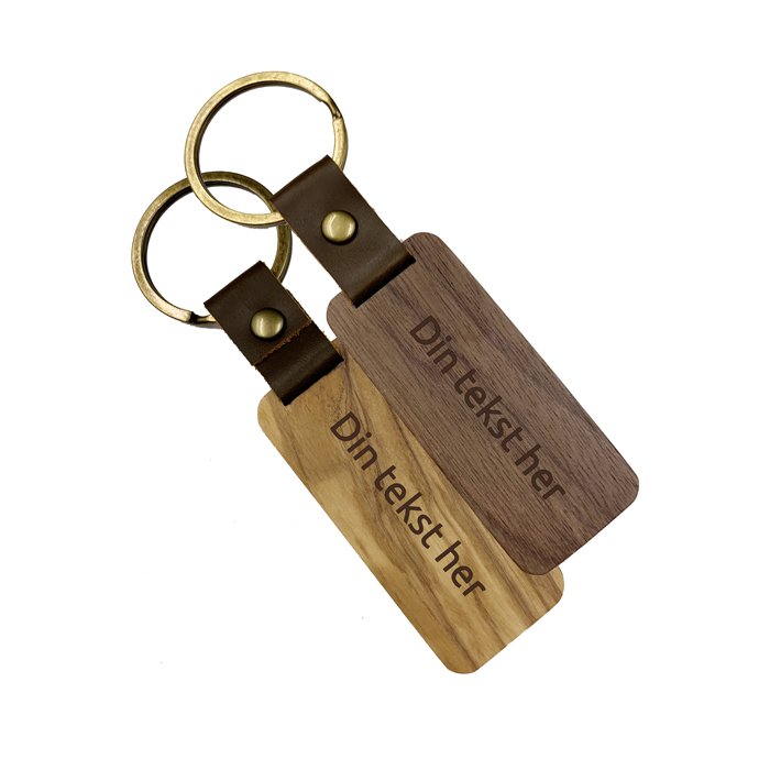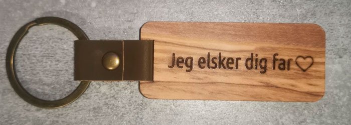 Nøglering i træ. Vælg mellem oliven eller valnød. Træ er et naturmateriale og der kan derfor være variationer i træet i forhold til billederne. Se eksempler herunder. Ønskes f.eks. et hjerte på graveringen indsættes blot <3 i teksten. Længden er ca 11 cm inkl nøglering.