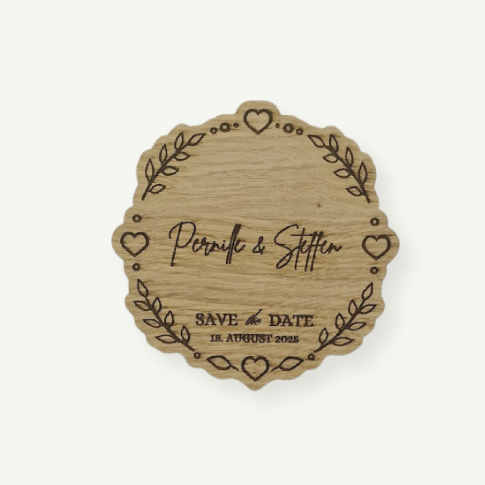 Gør jeres bryllupsdato til noget særligt med dette elegante kort i træ – smukt lasergraveret med blade- og hjerte-motiv og tekst “Save the Date”.
