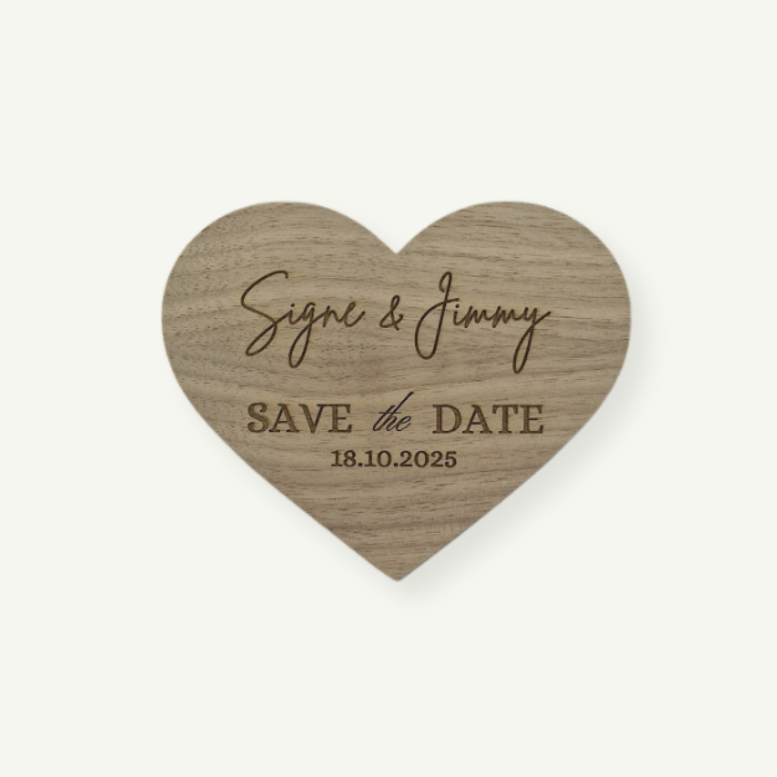 Hjertet står som ikon for kærlighed, samhørighed og glæde. Lasergraveringen giver et skarpt og stilrent motiv uden blæk eller tryk, så træets struktur og varme kommer til sin ret – et håndgribeligt minde om dagen, I glæder jer til.